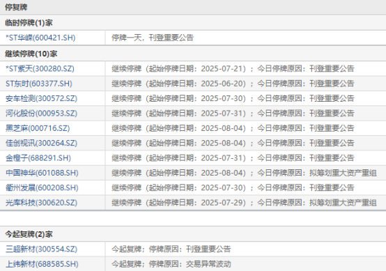 上证报中国证券网讯 8月5日免费杠杆配资门户网,1家公司临停:*st华嵘,2家公司复牌:三超新材(维权)、上纬新材。