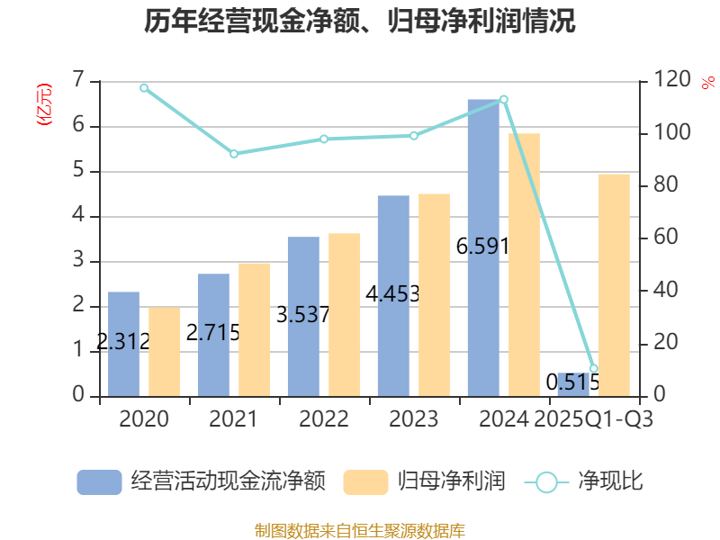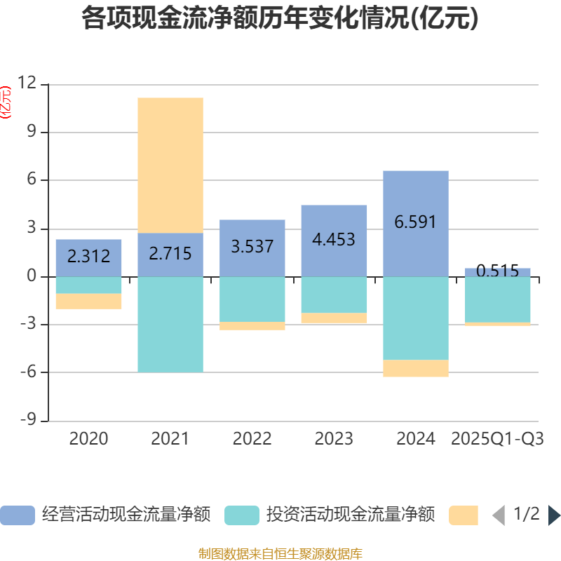 2025年前三季度,公司经营活动现金流净额为5151.13万元,同比增加1.02亿元;筹资活动现金流净额-2151.87万元,同比增加5982.11万元;投资活动现金流净额-2.87亿元,上年同期为-2.38亿元。