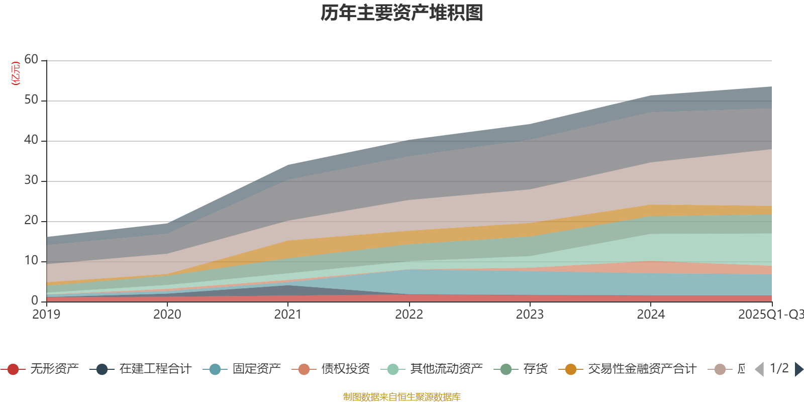 资产重大变化方面,截至2025年三季度末,公司应收票据及应收账款较上年末增加34.25%,占公司总资产比重上升5.87个百分点;货币资金较上年末减少18.42%,占公司总资产比重下降5.3个百分点;债权投资较上年末减少32.56%,占公司总资产比重下降2.14个百分点;其他流动资产较上年末增加19.55%,占公司总资产比重上升1.91个百分点。